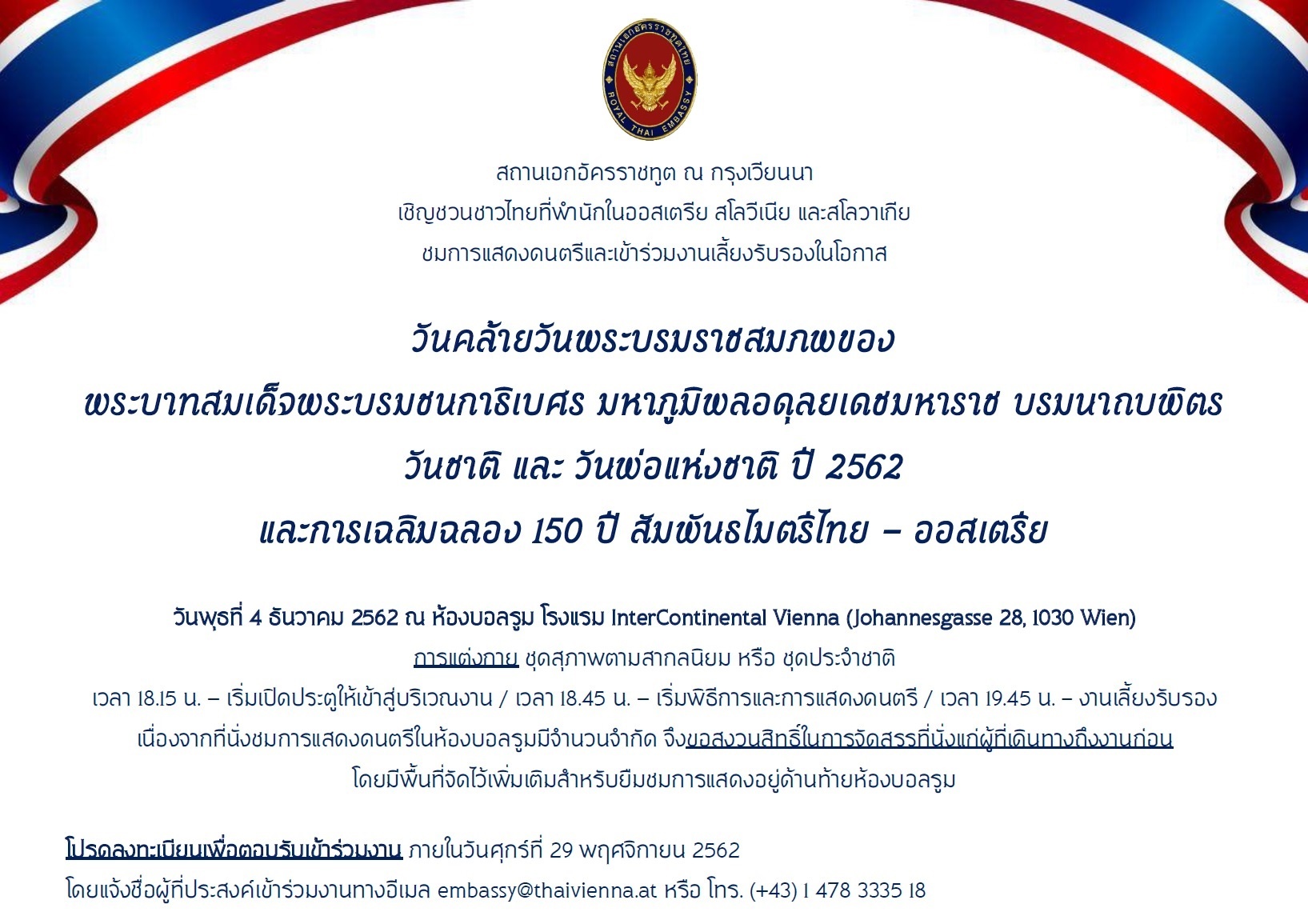 สอท. ณ กรุงเวียนนา เชิญชวนชาวไทยที่พำนักในออสเตรีย สโลวีเนีย และสโลวาเกีย ชมการแสดงดนตรีและร่วมงานเลี้ยงรับรองในโอกาสวันคล้ายวันพระบรมราชสมภพพระบาทสมเด็จพระบรมชนกาธิเบศร มหาภูมิพลอดุลยเดชมหาราช บรมนาถบพิตร วันชาติ และวันพ่อแห่งชาติ ปี 2562 และการเฉลิมฉลอง 150 ปี สัมพันธไมตรีไทย-ออสเตรีย ในวันพุธที่ 4 ธันวาคม 2562 ณ ห้องบอลรูม โรงแรม InterContinental Vienna (Johannesgasse 28, 1030 Wien)