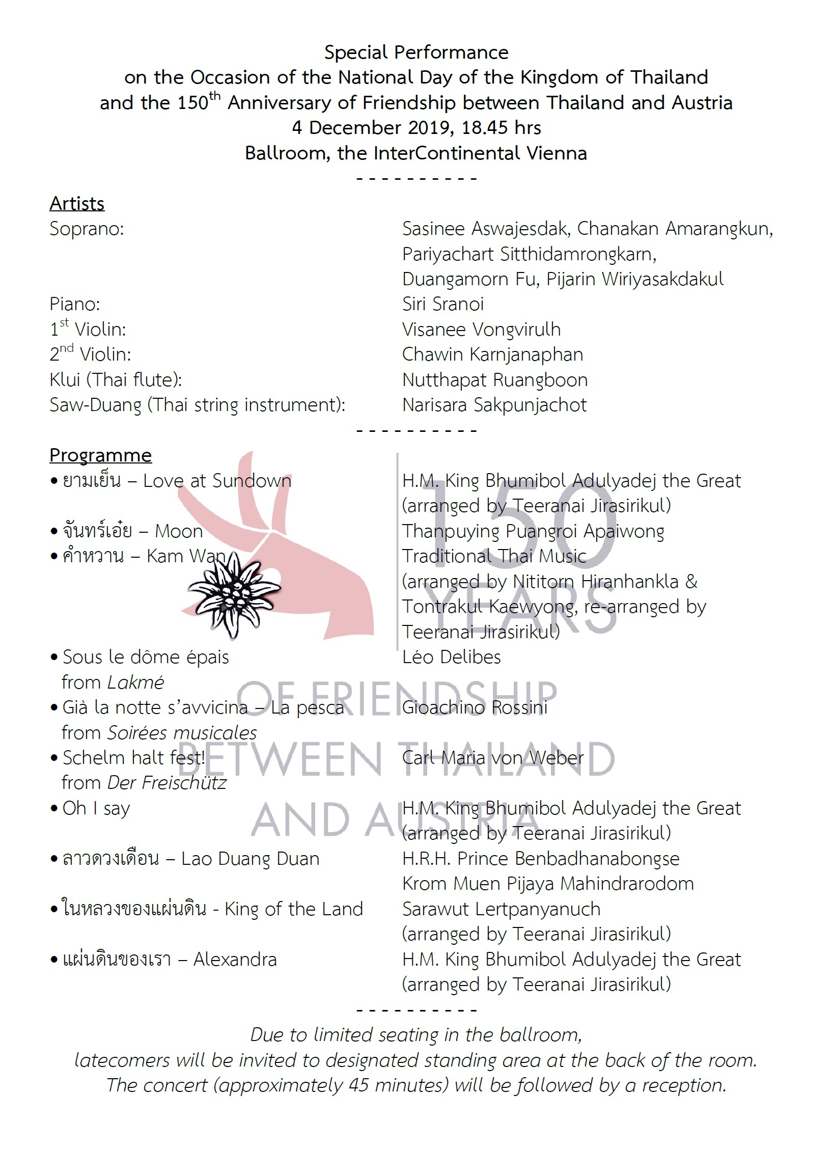 สอท. ณ กรุงเวียนนา เชิญชวนชาวไทยที่พำนักในออสเตรีย สโลวีเนีย และสโลวาเกีย ชมการแสดงดนตรีและร่วมงานเลี้ยงรับรองในโอกาสวันคล้ายวันพระบรมราชสมภพพระบาทสมเด็จพระบรมชนกาธิเบศร มหาภูมิพลอดุลยเดชมหาราช บรมนาถบพิตร วันชาติ และวันพ่อแห่งชาติ ปี 2562 และการเฉลิมฉลอง 150 ปี สัมพันธไมตรีไทย-ออสเตรีย ในวันพุธที่ 4 ธันวาคม 2562 ณ ห้องบอลรูม โรงแรม InterContinental Vienna (Johannesgasse 28, 1030 Wien)