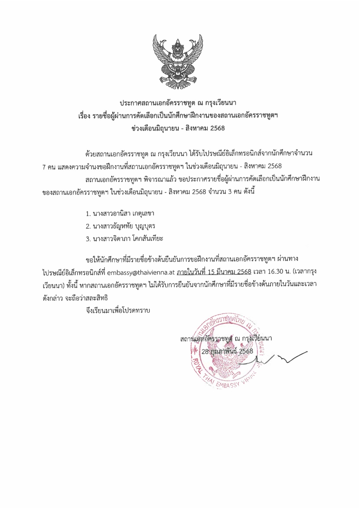 ประกาศรายชื่อผู้ผ่านการคัดเลือกเป็นนักศึกษาฝึกงานของสถานเอกอัครราชทูตฯ