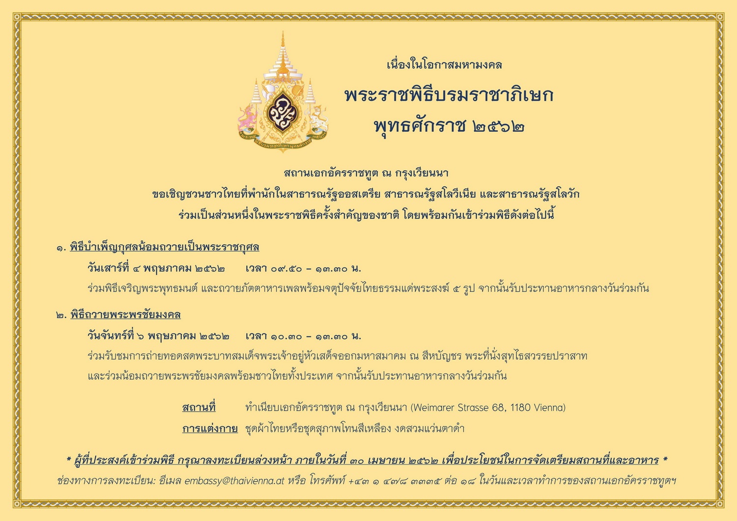 เนื่องในโอกาสมหามงคลพระราชพิธีบรมราชาภิเษก พุทธศักราช ๒๕๖๒ สถานเอกอัครราชทูต ณ กรุงเวียนนา ขอเชิญชวนชาวไทยที่พำนักในสาธารณรัฐออสเตรีย สาธารณรัฐสโลวีเนีย และสาธารณรัฐสโลวัก ร่วมเป็นส่วนหนึ่งในพระราชพิธีครั้งสำคัญของชาติ โดยพร้อมกันเข้าร่วมพิธีดังต่อไปนี้